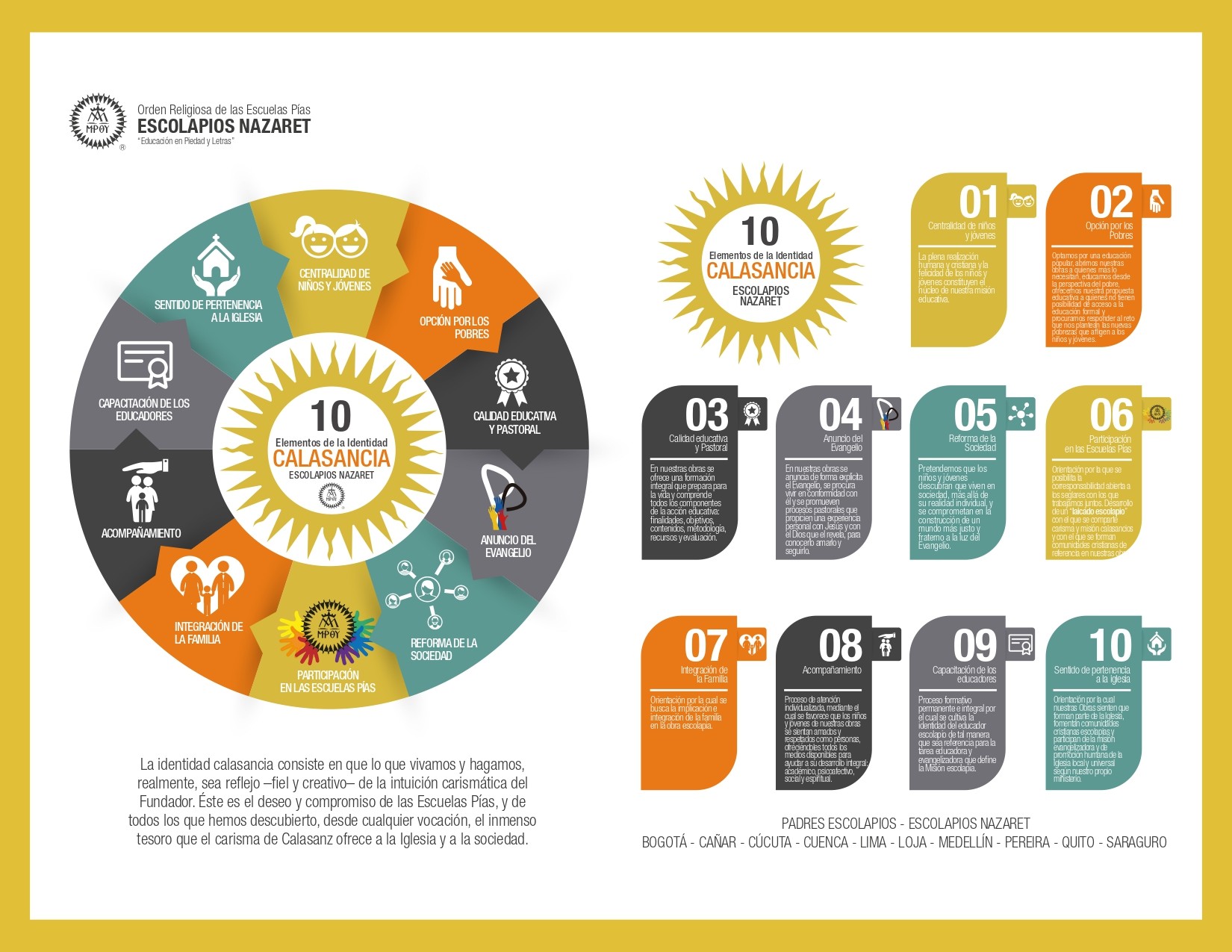 Los Padres Escolapios estamos comprometidos con nuestros niños y jóvenes, desde nuestra llegada a Colombia en 1948, Ecuador en 1964 y Perú en el 2017. La obra de Calasanz se encuentra en Cañar, Cuenca, Saraguro y Loja por parte de Ecuador. Por Colombia estamos en las ciudades de Bogotá, Medellín, Cúcuta y Pereira. En Perú, nuestra fundación más reciente (2017) nos encontramos en la ciudad de Lima, Centro Poblado Virgen del Carmen La Era Ñaña-Lurigancho.
