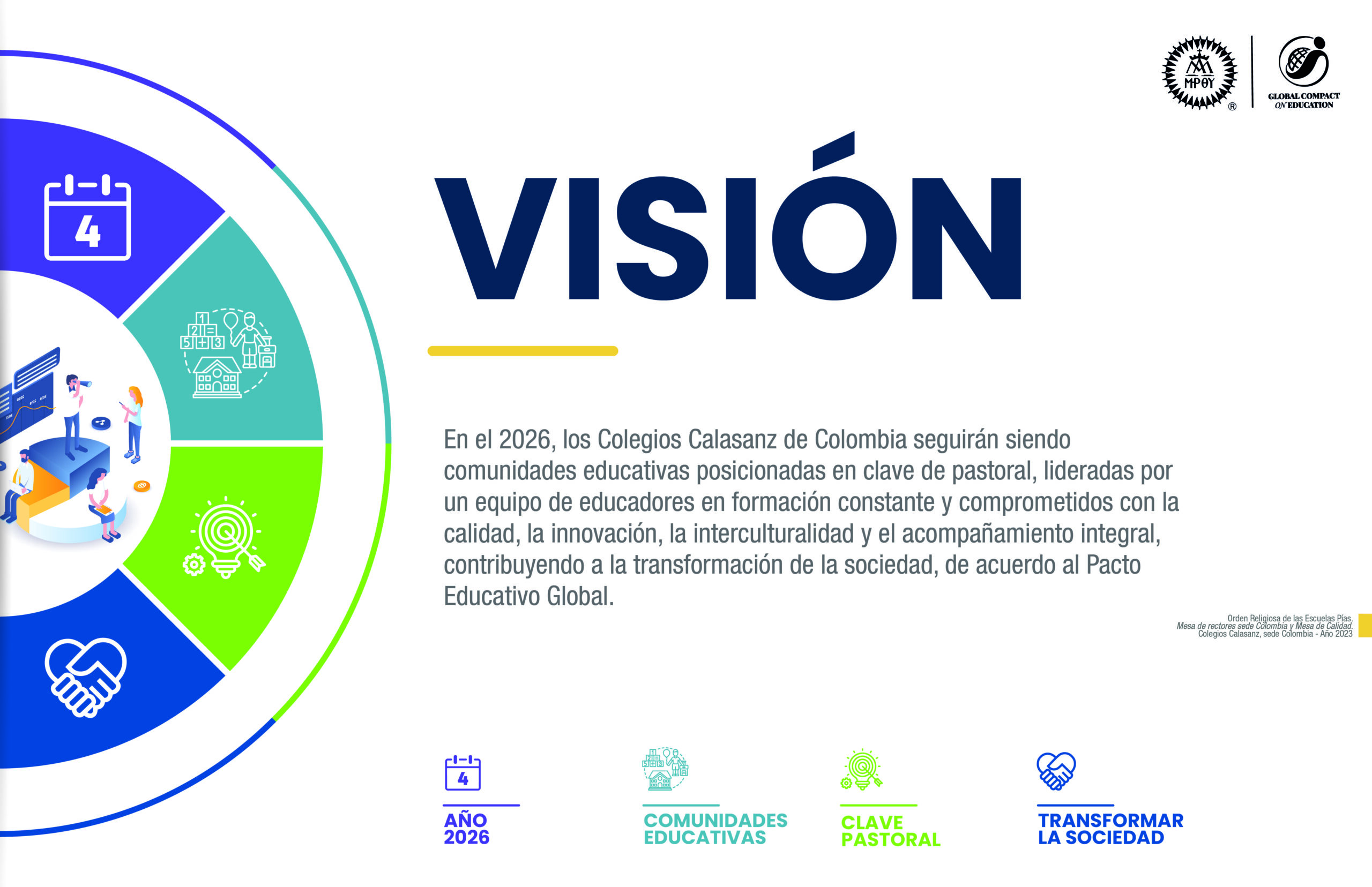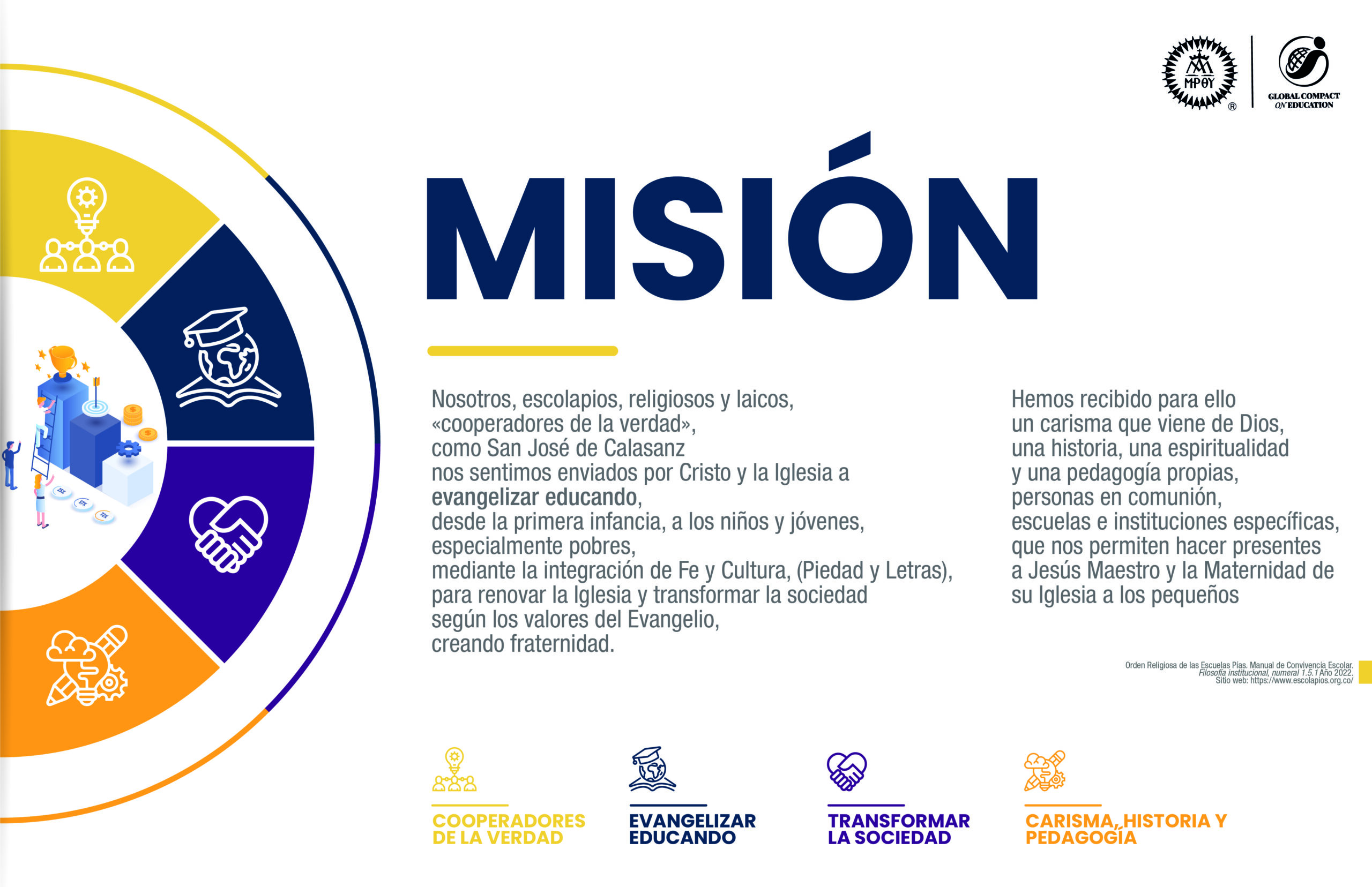 Nuestras obras se destacan no sólo por la Excelencia Académica, también por su formación en el Compromiso Ético, la Construcción en la Identidad de nuestros alumnos y el Discernimiento Vocacional para ayudarles a descubrir su misión en la construcción del mundo, según los valores evangélicos de Justicia, Paz y Solidaridad.